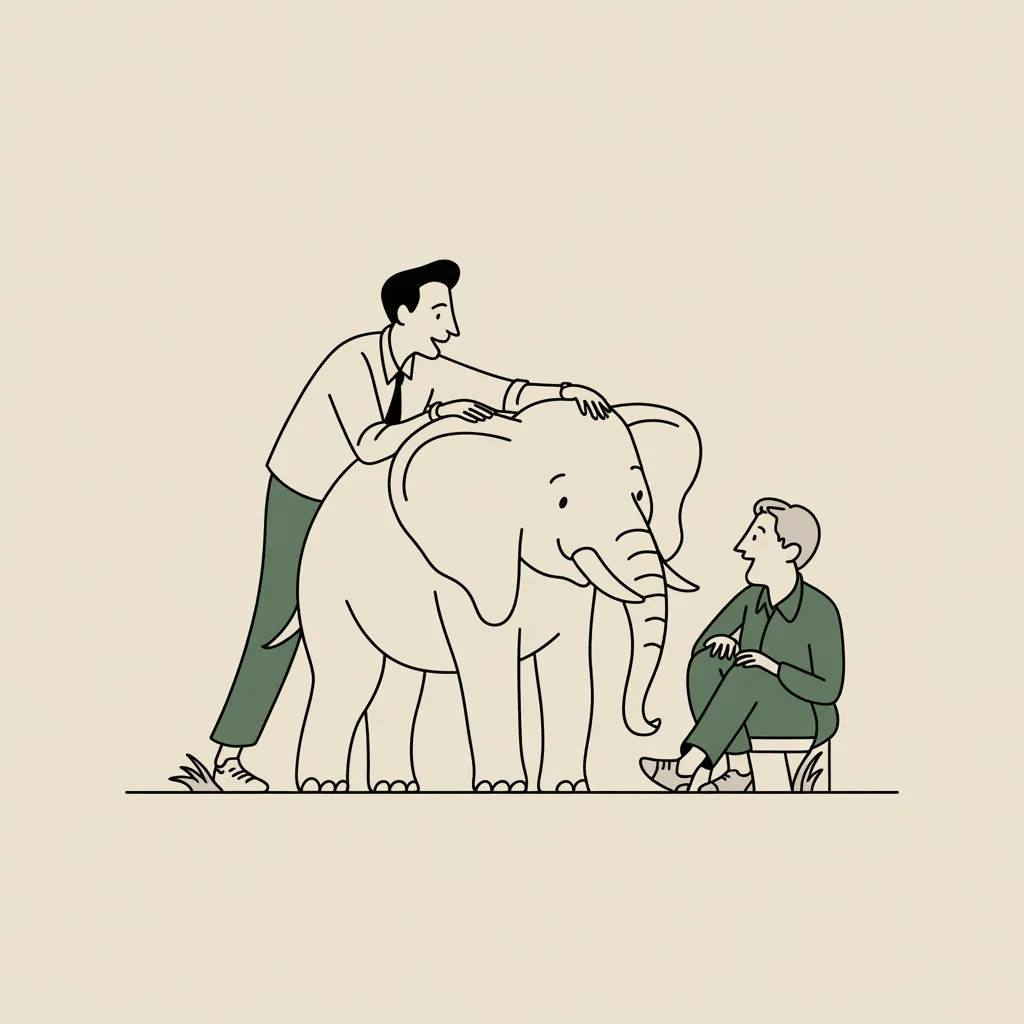 The elephant is about content — the thing that everyone in the room knows is true but nobody is naming. Your friend’s marriage is falling apart and you’re both dancing around it. You haven’t talked to someone in two years and you’re both pretending that’s fine. Someone at the table is drinking too much and everyone is watching it happen in silence.